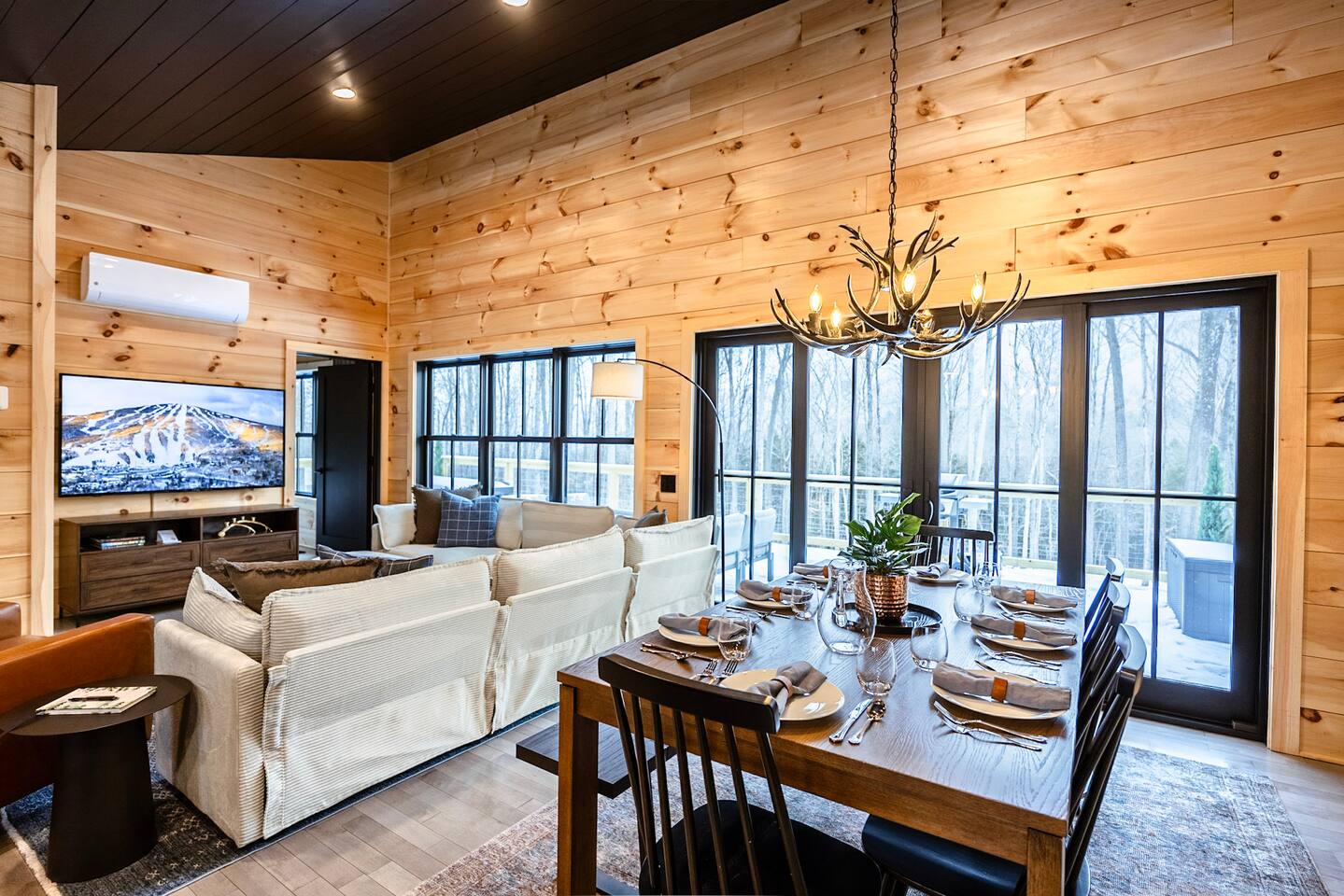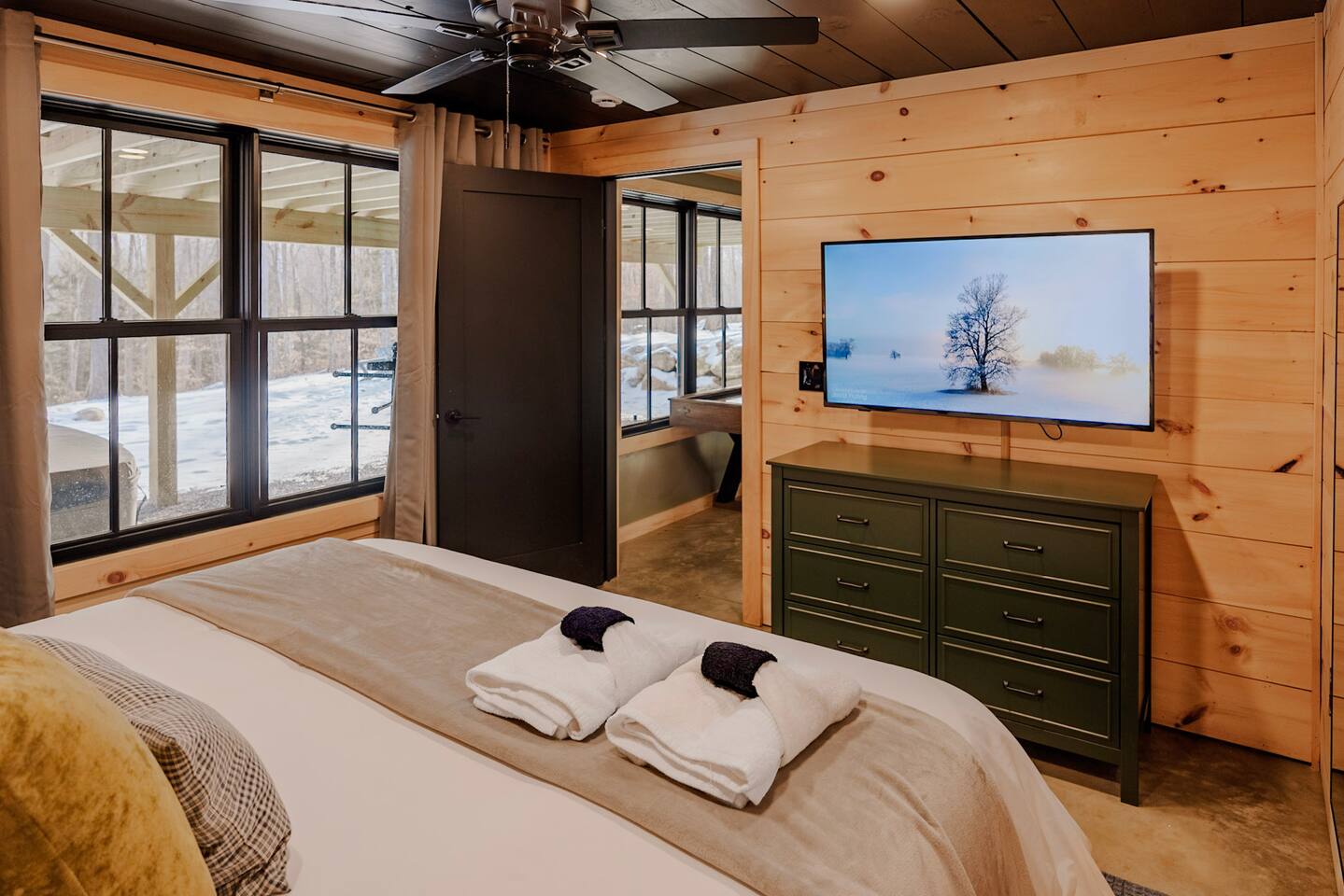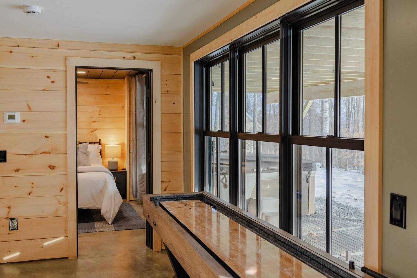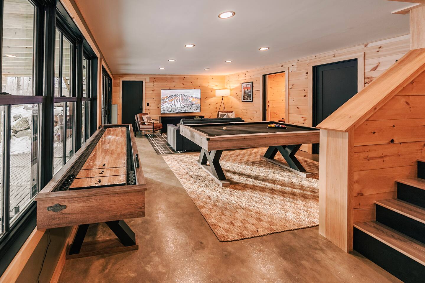 This cabin provides 3 cozy bedrooms and 3 full bathroom: -Bedroom 1 has one King bed, and en-suite bathroom -Bedroom 2 has one King bed and en-suite bathroom -Bedroom 3 has one King bed and en-suite bathroom -Lower Level has one Queen pull out couch -Fully equipped kitchen -Dining room seating includes a dining table with seating for 8, and 3 stools at the island -Smart TVs in both living spaces, and all bedrooms -Desk in Bedroom #1 -Lower Level includes shuffleboard, pool table, board games -Washer + Dryer -Tesla Powerwall- whole home back up power, in case of an outage Outdoor Space Includes: -Hot Tub -Sauna -Tesla EV Charger -Fire pit with 8 chairs -Expansive Deck with Dining Table (seating for 8) -Outdoor Sofa -Weber Grill -Large backyard with woodsy Mountain Views -We are located on a rural residential street with neighbors on both sides. Main Floor: Step into our cozy, yet modern cabin with serene back deck. The open-concept living space features warm natural wood paneling, vaulted ceilings with a dramatic black accent, and large windows that bring in plenty of natural light. Relax on the sectional sofa or the leather recliner, perfect for unwinding after a day of adventure. Whether you’re sipping your morning coffee or enjoying a cozy evening inside in front of the electric fireplace, this space is designed for relaxation and connection. Kitchen: The fully equipped kitchen boasts sleek black cabinets, stainless steel appliances, and a spacious island with seating for three. There is a complimentary coffee station with your coffee necessities and hot chocolate for the kids! Gather around the 8 person dining table for a home-cooked meal or game night. King Bedrooms 1 & 2: Two Bedrooms are located on the main level, both with their own en-suite bathrooms and woods/mountain views. Both Bedrooms have comfy king beds, with bamboo linens, 50” smart TVs, full length mirrors, and rain showers with bluetooth speakers. Bedroom 2 has a make-up vanity for getting ready. Bedroom 1 has a desk, should you need to get some work done. Fast Wifi from Xfinity will help you stay connected. Deck: Off of the main level you will find the spacious deck with woodsy views of several mountain ranges and an outdoor sectional couch. Use the Stainless Steel Gas BBQ grill to make your favorite meal and enjoy it at the outdoor dining table with seating for 8. Lower Level: Downstairs you will find Bedroom #3 with a king bed and on-suite bathroom with shower/tub combo. There is also a 50" smart TV as well as a full-length mirror. In the closet you will find an iron and ironing board. The basement does not have AC, but generally stays pretty cool in the summer months. The lower level has an additional living space and game room. Kids and adults will enjoy the shuffleboard table, pool table and board games. There is a 75" TV, perfect for a movie night or catching a game. Lower level walks out to patio where you can enjoy a relaxing night soaking in the hot tub or winding down in the sauna. Firewood will be provided for the fire pit. Drive your car around to the back to access the lower level ski drop/storage room. A dog bed and bowls are provided for your furry friend. They are located in the laundry room. Laundry detergent and dryer sheets are provided for your extended stay. Additional photos, video tour and general property updates may be found on our social media page: @boulderruncabin_vt Ready to hit the slopes? ~20 minutes to Bromley Ski Resort ~33 minutes to Stratton Ski Resort ~35 minutes to Magic Mountain Ski Resort Nearby Towns ~9 minutes to Manchester (shops, outlet stores, dining and more) ~9 minutes to Arlington ~20 minutes to Bennington Outdoor Adventures and Unique Experiences -Vermont Mountain Adventures, Snowmobiling Tours: 10 mins -Land Rover Experience Driving School: 10 mins -Orvis Fly Fishing School: 10 mins -Green Mountain Falconry School: 10 mins -Equinox Golf Resort & Spa: 10 minutes -Lye Brook Falls hiking area: 10 minutes -Hildene Homestead: 15 minutes Please note the following house rules: Only two dogs are allowed per stay and there is a $200 pet fee per stay. There will be additional charges for any additional unapproved dogs on the property. No other pets are allowed. Please be sure to pick up after your dogs. Please no dogs on the furniture. Excessive dog hair will result in an additional cleaning fee. No parties allowed. The maximum amount of people allowed is the amount listed at the time that you book. There will be a $500 fee for any unapproved extra guests. Smoking or vaping is prohibited inside. If you do smoke outside, please pick up all remnants. Minors must be supervised by an adult when using the hot tub, sauna or fire pit. The hot tub, sauna and fire pit are to be used at your own risk.